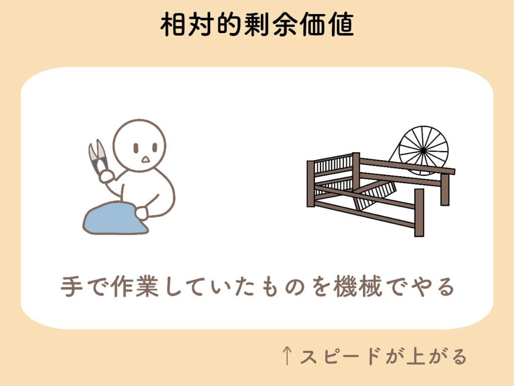機械を使って働くスピードを速くすることを、マルクスの言い方で「相対的剰余価値」と言います。
