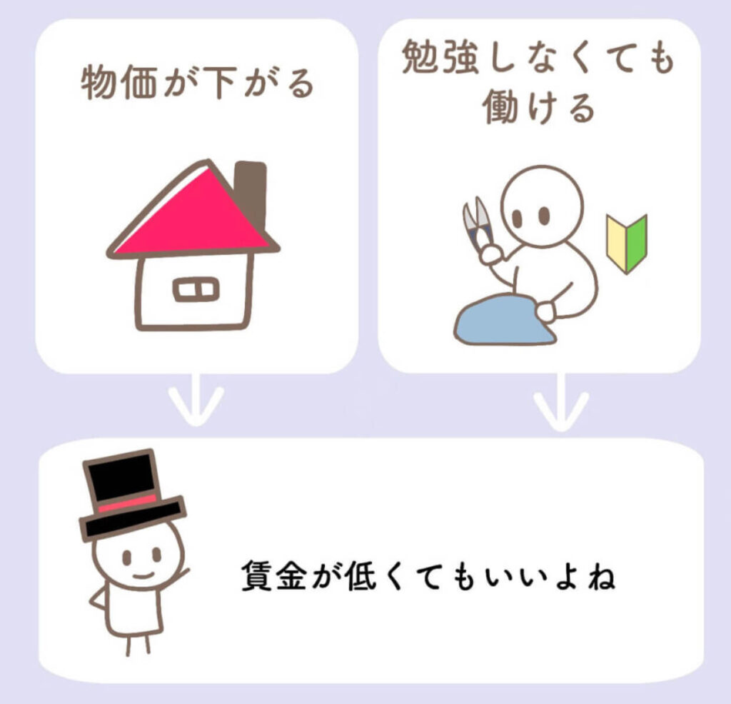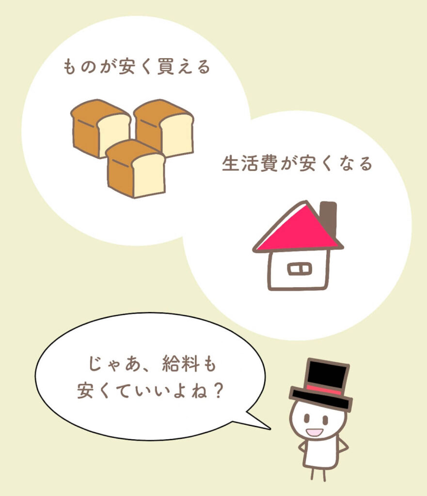 物価が下がり、労働者の消費する生活用品が安く買えるようになれば、生活費が下がります。