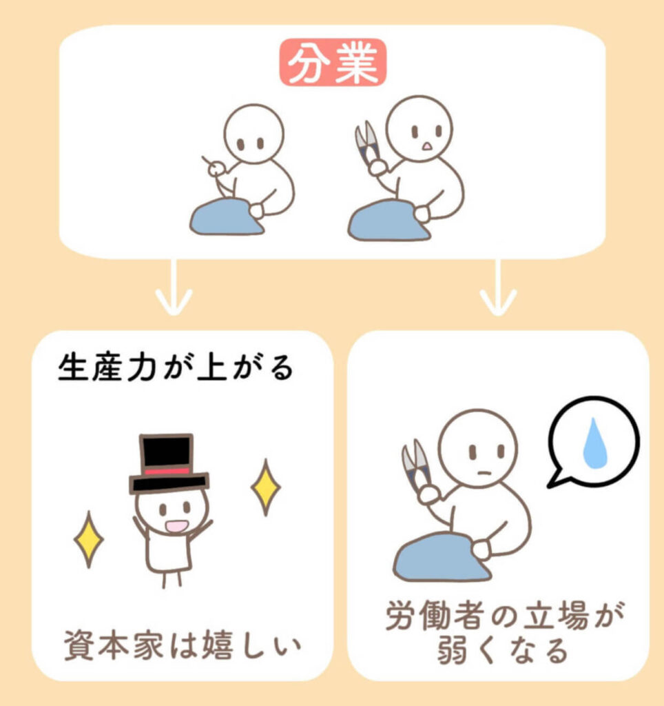 分業によって、労働力の価値が安くなると、剰余価値が増えて、資本家の利益が増えるのです。