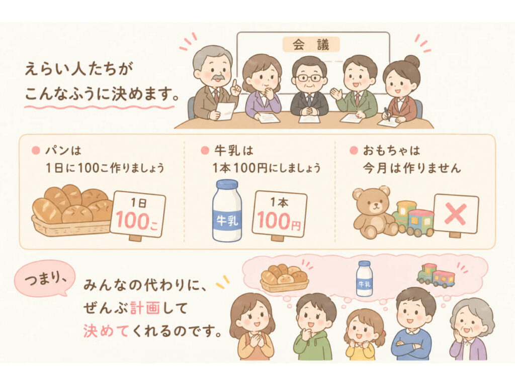 計画経済とは、「何をどれだけ作るか、いくらで売るかを決めるしくみ」です。