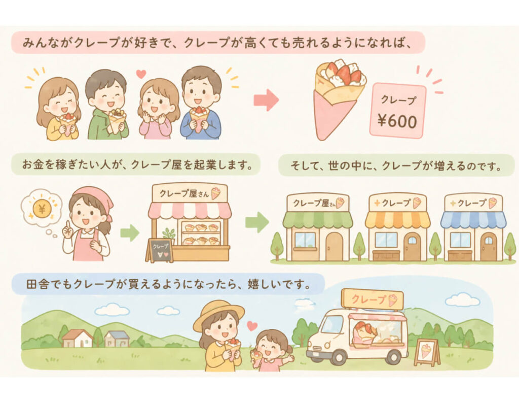 例えば、クレープが人気になれば、たちまちクレープ屋が増えて、田舎でもクレープが買えるようになったりします。