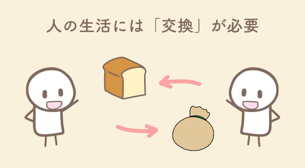 私たちは、生活をするために、自分が作った商品を他の商品と交換しなければいけません。