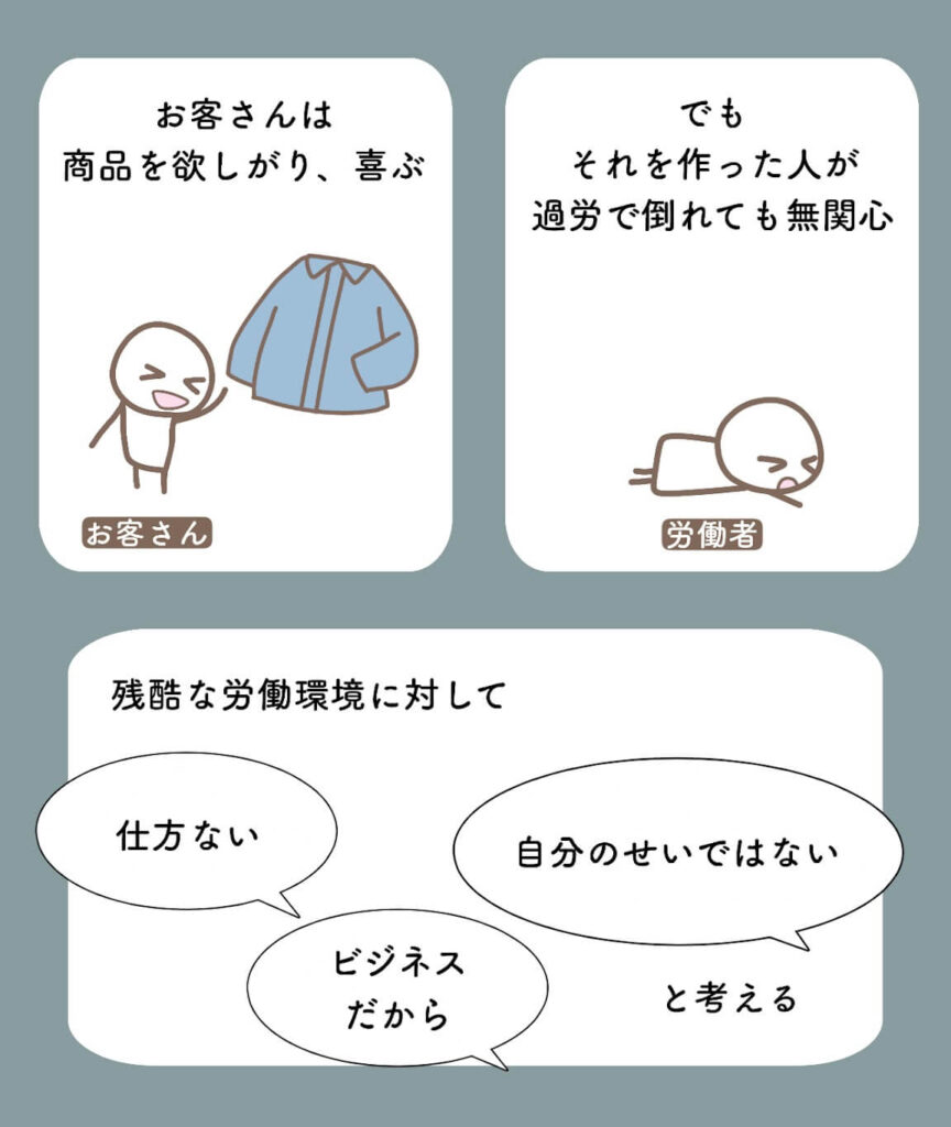お客さんは、商品を買うことで喜ぶのに、その商品を作った人が過労で倒れたとしても「しょうがないこと」として無視します。