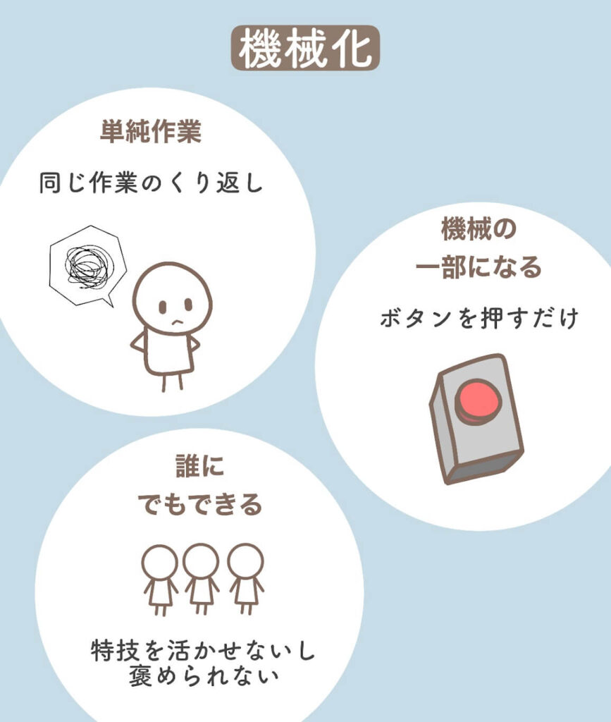まず、機械化をすると、仕事は単純作業になります。