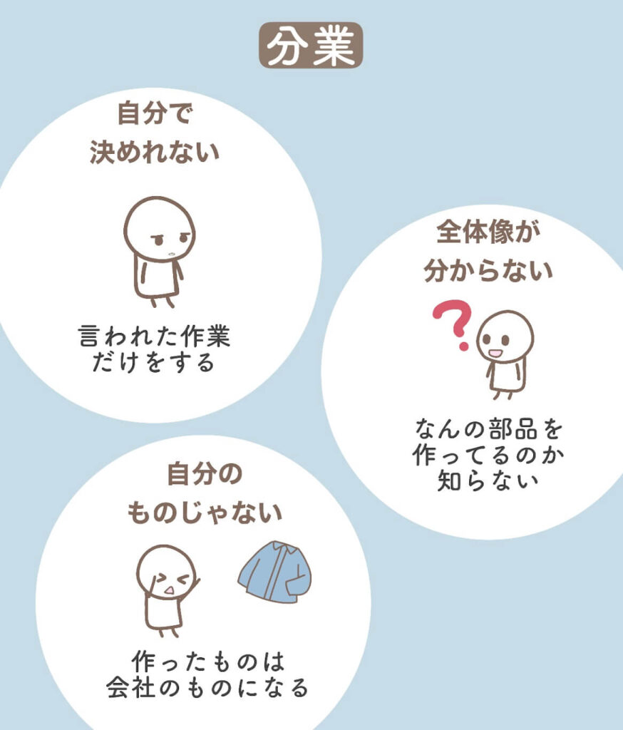 また、仕事が分業されると、自分が作ってるものが何に使われているのか分かりづらくなります。