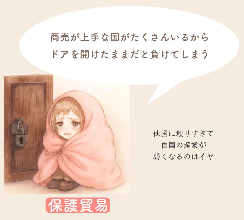 保護貿易さんは、自分の国の産業を守るために、ドアにカギをかけている状態です。