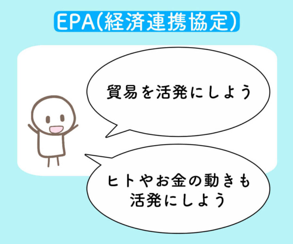 FTAは、モノやサービスの貿易に限定した協定ですが、EPAは、ヒト、お金の動きの強化も目指します。
