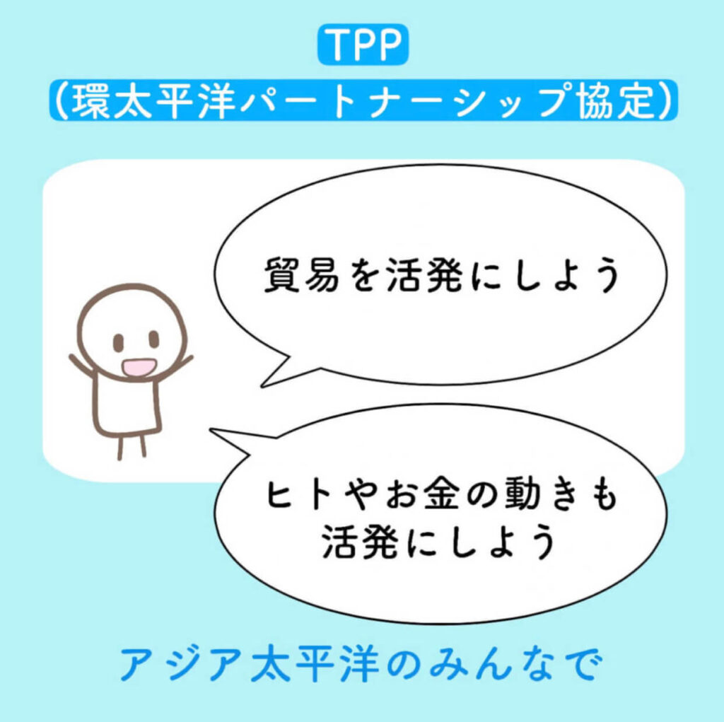 TPPとは、アジア太平洋のみんなで、モノ、ヒト、カネの動きを活発にしようとするものです。