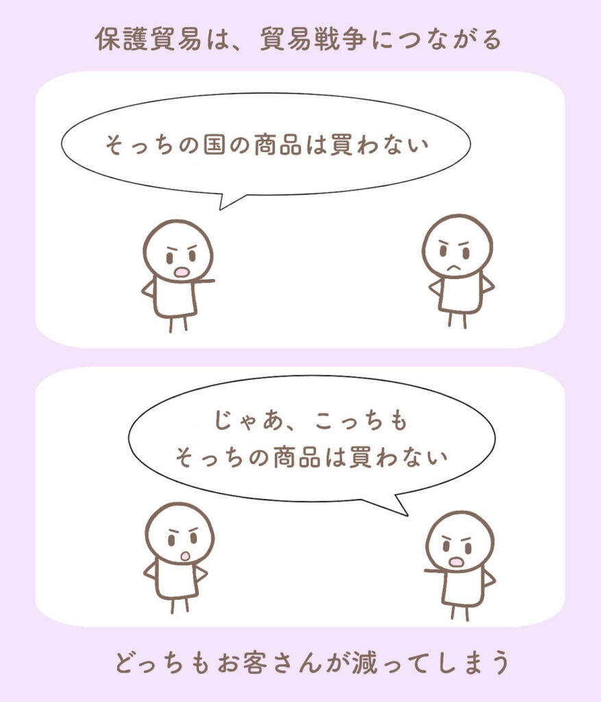 しかし、保護貿易を続けていると、貿易戦争が起きてしまいます。
